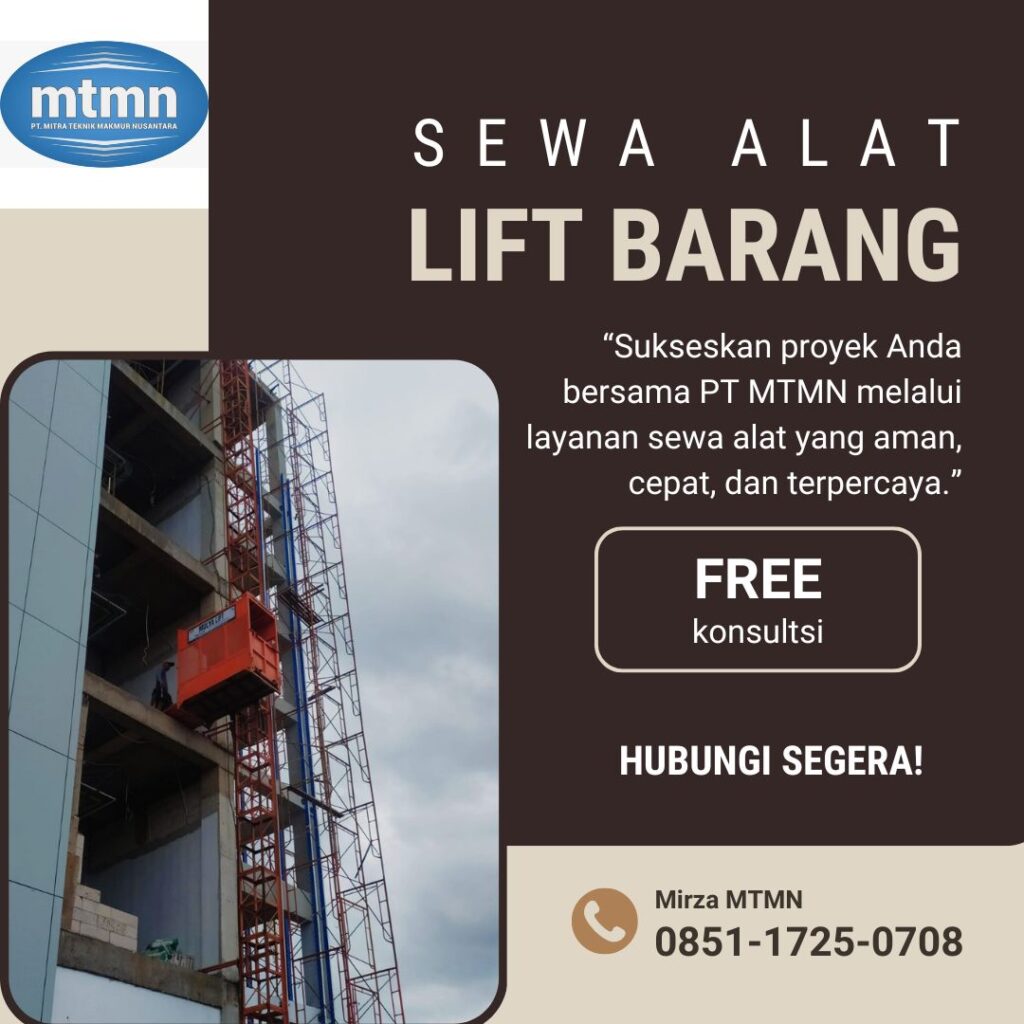 Bangun proyek jadi lebih cepat, aman, dan efisien dengan layanan sewa lift barang profesional di Pandeglang dari PT. Mitra Teknik Makmur Nusantara (MTMN).