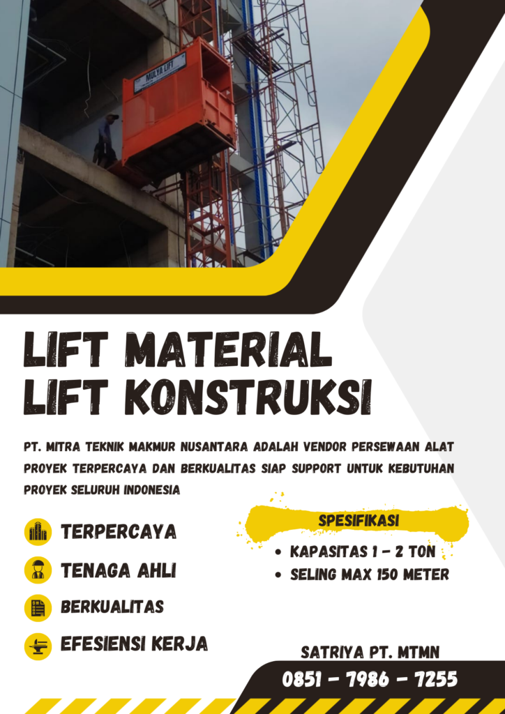 Bangun proyek jadi lebih cepat, aman, dan efisien dengan layanan sewa lift barang profesional di Samosir dari PT. Mitra Teknik Makmur Nusantara (MTMN).