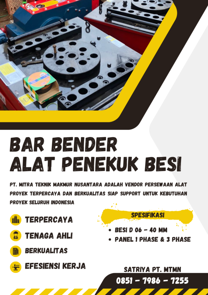 PT. Mitra Teknik Makmur Nusantara (MTMN) merupakan penyedia jasa sewa Bar Bender proyek terpercaya di Balangan, Kalimantan Selatan, meliputi Bar Bender 1 Phase dan Bar Bender 3 Phase dengan sistem keamanan berstandar industri.