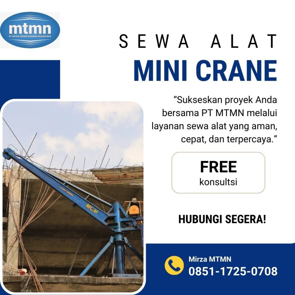 PT. Mitra Teknik Makmur Nusantara (MTMN) menyediakan layanan sewa mini crane profesional di Ponorogo, Jawa Timur untuk mendukung pekerjaan pengangkatan material yang membutuhkan ketepatan, keamanan, dan efisiensi tinggi. Mini crane kami dirancang untuk mengangkat material proyek secara stabil, presisi, dan sesuai standar keselamatan kerja konstruksi.